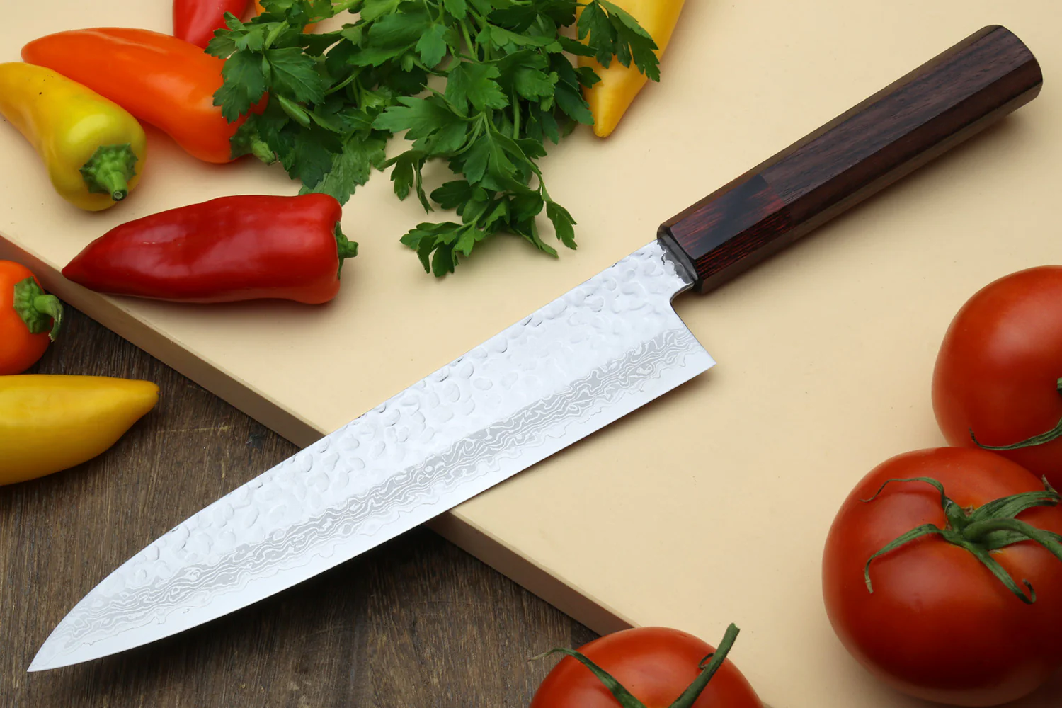 The blade's hammered surface not only highlights its hand-forged character but also reduces drag and minimizes food sticking. Paired with a traditional octagonal Wa-style handle crafted from Shitan Rosewood, this knife offers a natural, ergonomic grip that feels light and responsive in hand—even during extended prep sessions. A magnolia wood Saya cover is included to protect the blade and complete its traditional Japanese aesthetic.