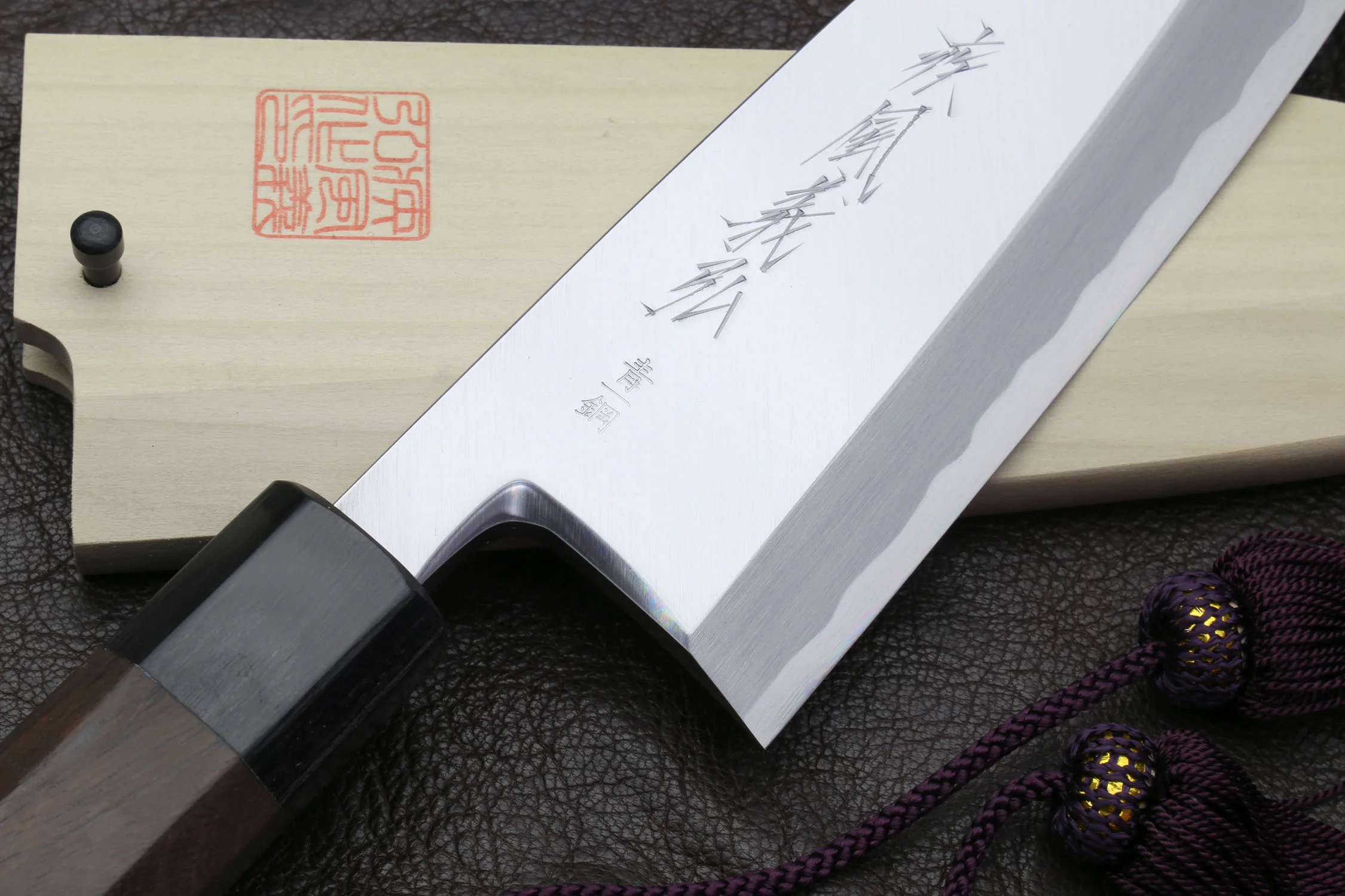 Complementing the exceptional functionality of our Aonamiuchi knives is a traditional Japanese handle crafted from the finest Shitan Rosewood, elegantly affixed with an Ebony bolster. Each knife is encased in a protective wooden sheath known as a Saya, enhancing its aesthetic appeal while safeguarding it when not in use. With its exceptional design and craftsmanship, the Deba knife is not only a powerful tool in the repertoire of many chefs but also a handcrafted work of art that elevates even the simplest of culinary tasks.