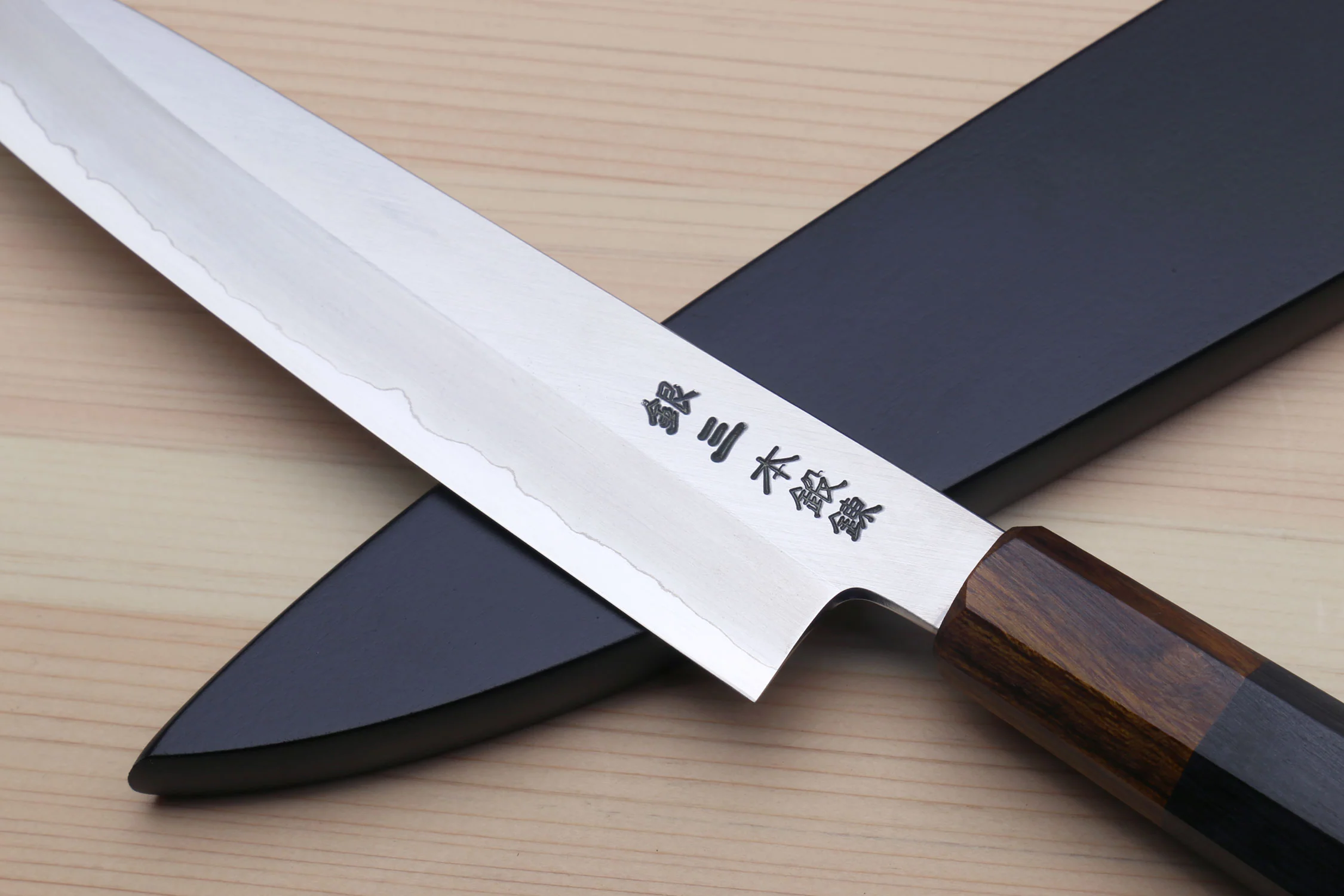 The Yoshihiro Hiryu Ginsan Series marries traditional Japanese knife-making methods with the latest advancements in metallurgy, setting a new standard in high-performance cutlery. Forged from Ginsan, a high-carbon steel with stain-resistant properties, this blade provides an exceptional balance of traditional Japanese sharpness and modern stainless steel durability. With a hardness of 62-63 HRC, Ginsan steel offers a rare combination of strength and ease of maintenance, while the Yoshihiro Hiryu Ginsan Series boasts a higher level of finish and polish than the standard Yoshihiro Ginsan and Hayate Ginsan knives.