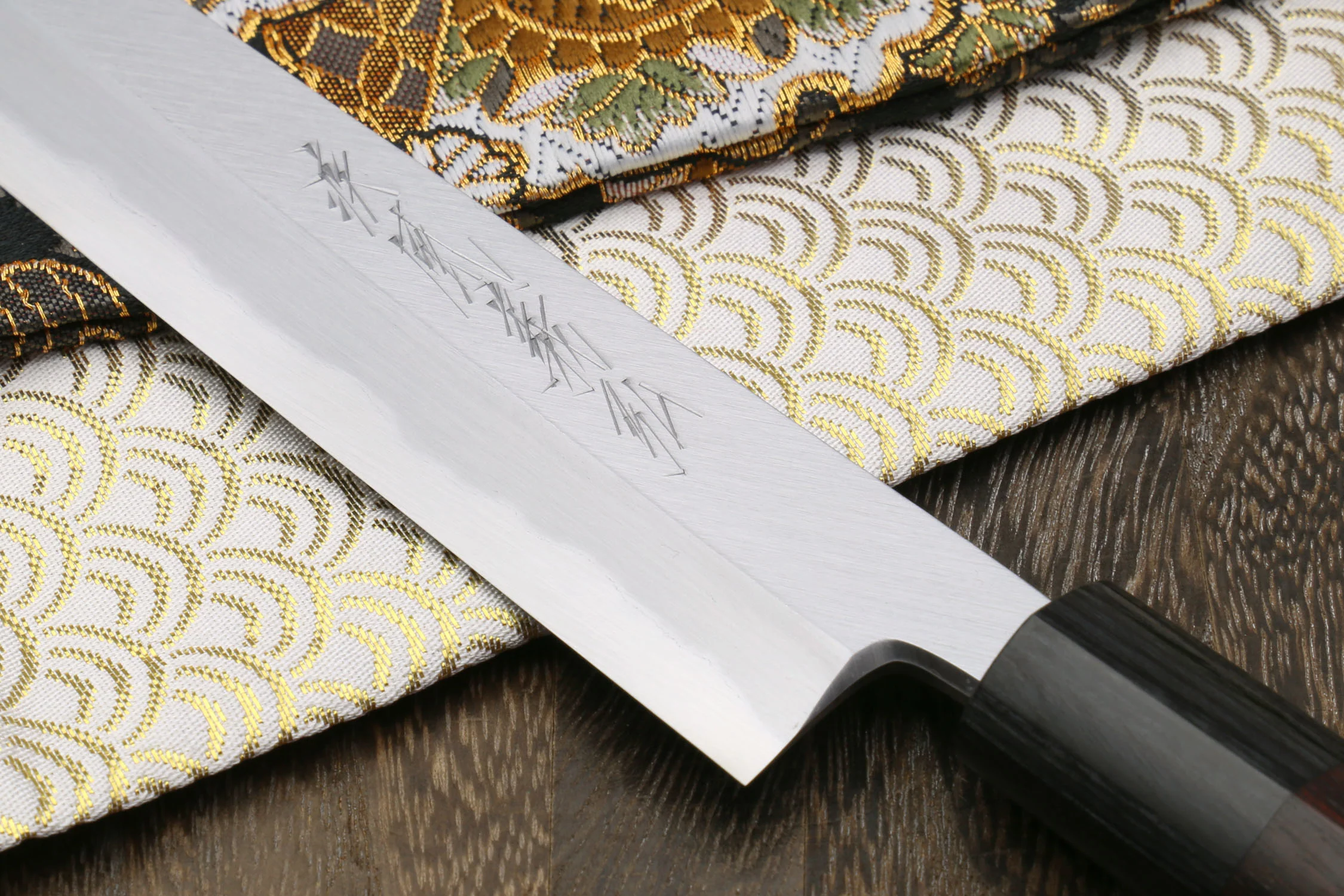 Yoshihiro Kasumi knives stand out for their incomparable craftsmanship and performance. They feature a traditional Japanese-style handcrafted Shitan wood handle, complemented by a Water Buffalo horn bolster for added elegance. A protective wooden sheath, known as a Saya, is included to safeguard the knife and enhance its appearance when not in use.
