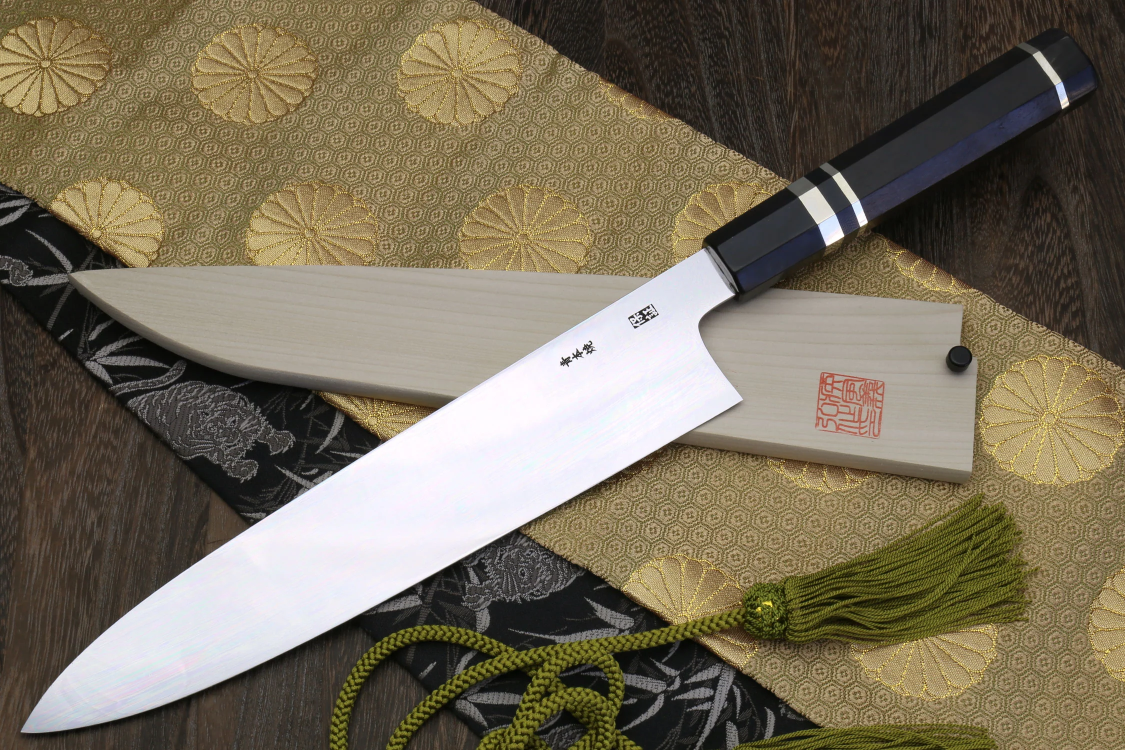 Yoshihiro Mizu Yaki Honyaki Blue Steel #2 Mirror Polished Wa Gyuto Japanese Chef Knife Triple Nickel Silver Ring Ebony Handle