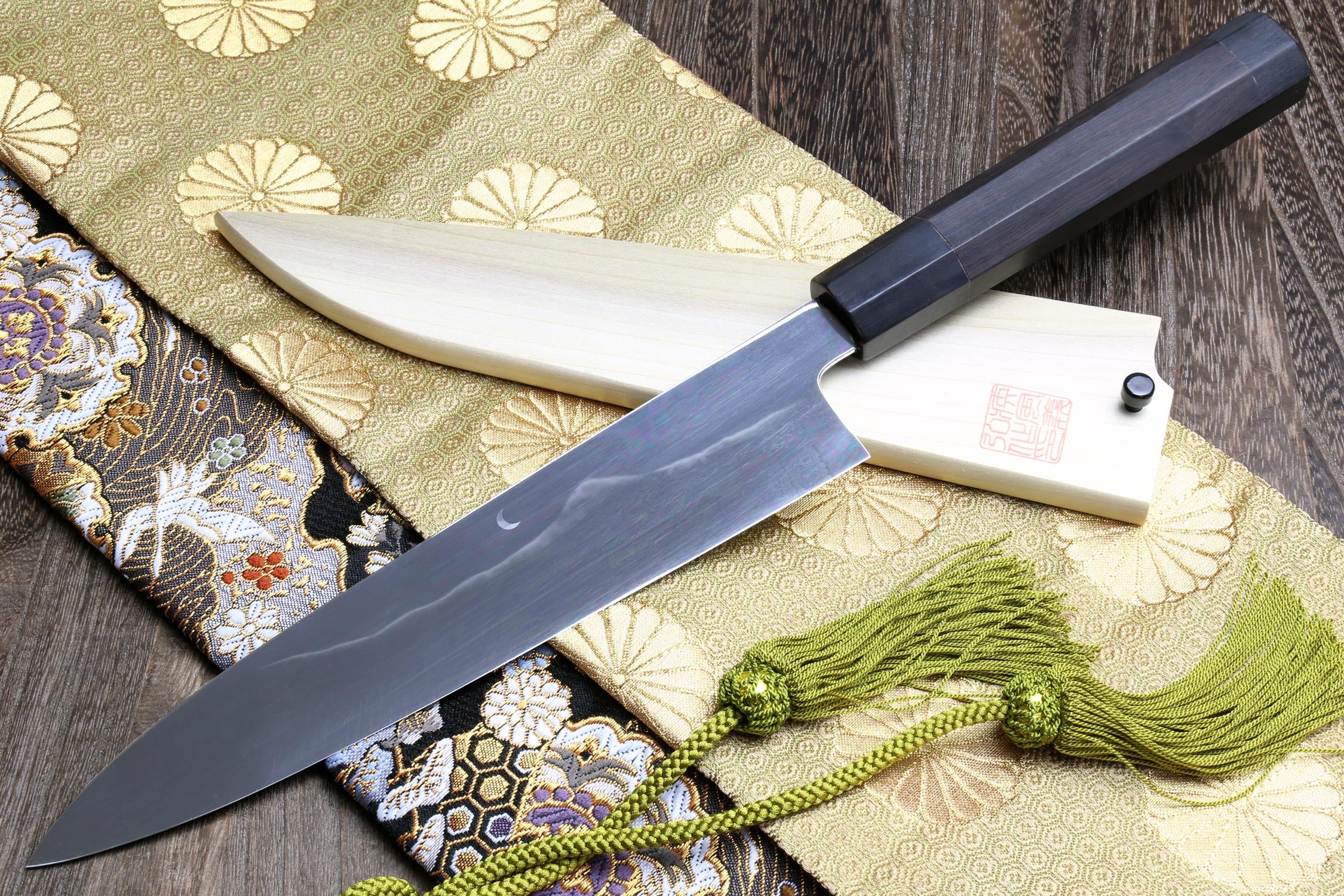 Our handmade Yoshihiro Honyaki knives are crafted with unparalleled expertise, forged from the finest quality steel using the ancient techniques of Japanese sword-making. With some artisans boasting over 50 years of experience, each knife reflects the highest level of craftsmanship. Made from a single piece of White Steel #1, these knives achieve a remarkable hardness of 66 on the Rockwell scale. The steel undergoes a meticulous process of heating in specialized hearths and is then quenched in cool water, resulting in knives that blend breathtaking aesthetics with superior performance.