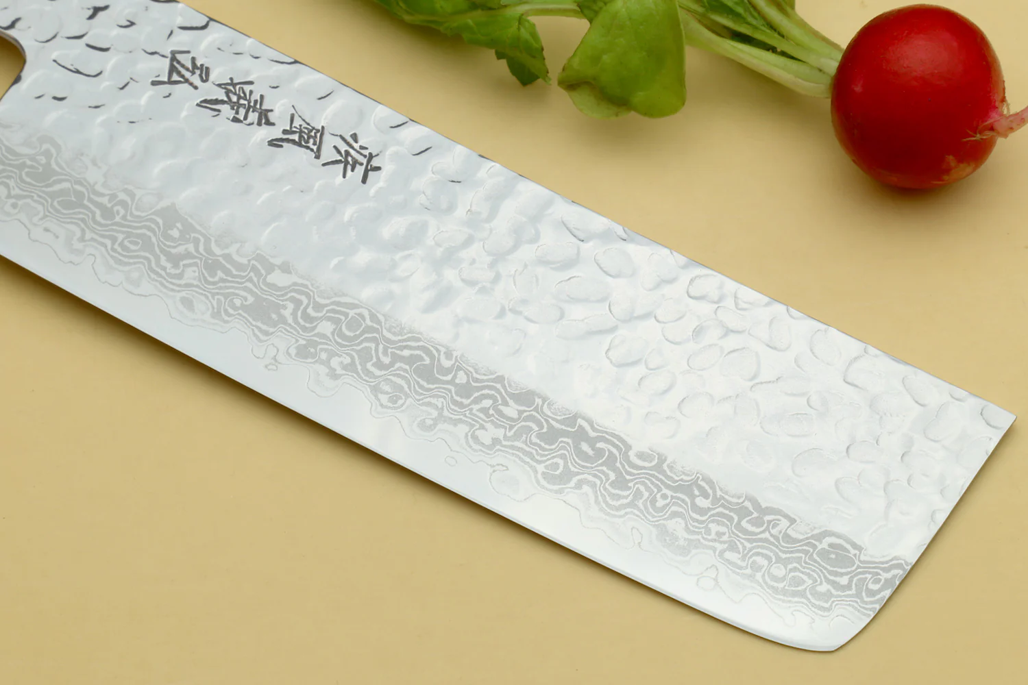 The VG-10 Hammered Damascus Nakiri Knife combines razor-sharp performance, exceptional durability, and comfort to create a professional-grade chef's tool that stands out in its price range. Its high-quality steel and meticulous craftsmanship ensure that it can withstand even the most demanding kitchen tasks. For maintenance, always sharpen and hone with premium Japanese water stones to preserve the integrity of the blade. Hand wash with mild soap and avoid the dishwasher to ensure the longevity of your knife. For sharpening or maintenance services, please contact Yoshihiro Cutlery for expert guidance.